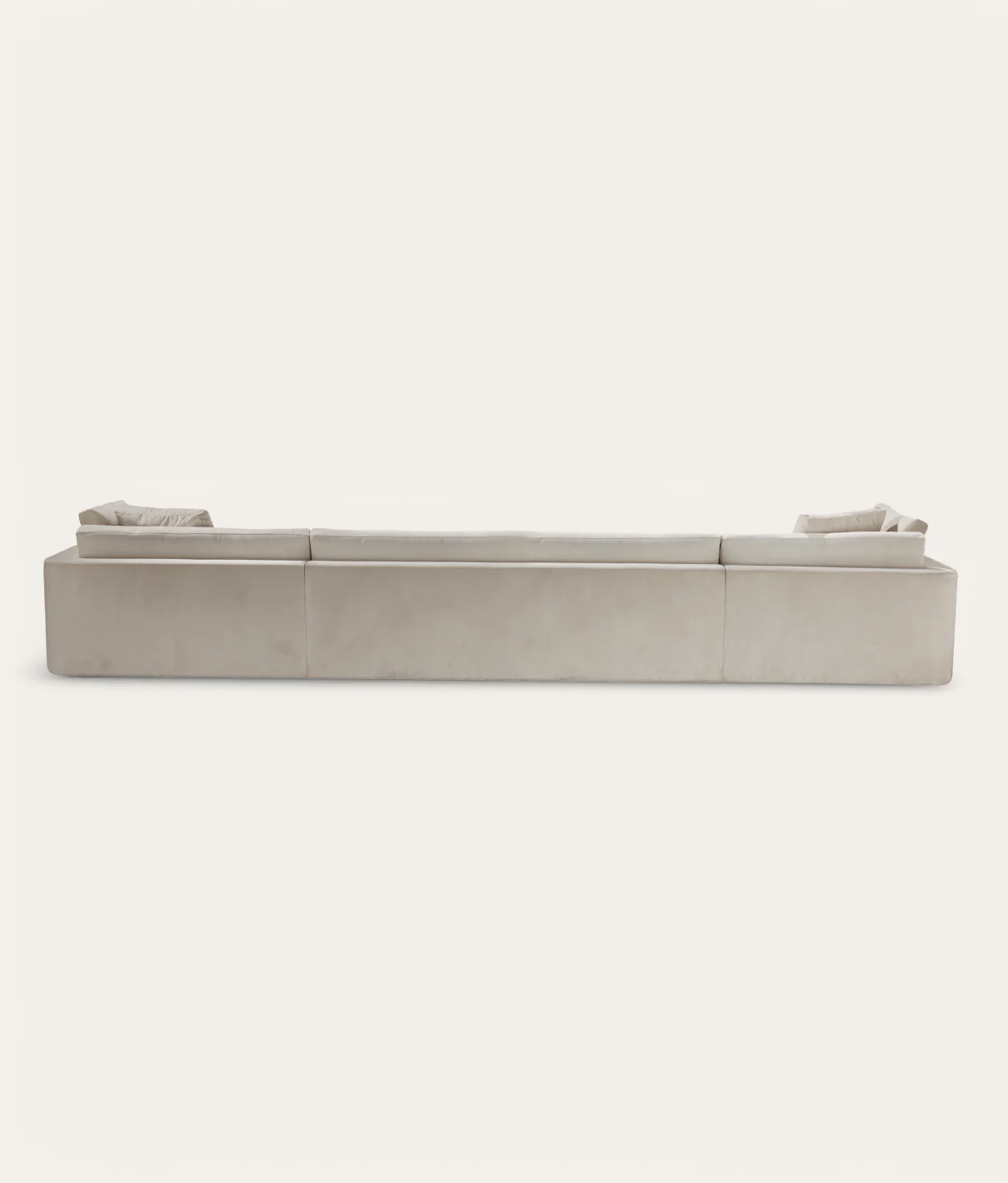 The Forma Sofa balances impactful presence with conversational ease. It's C shape, horseshoe design was created with intimate gatherings and relaxation in mind. Crafted in two complementary fabrics, the U shape main body showcases soft woven upholstery which is highly durable, tightly constructed and smooth, offering excellent wrinkle resistance, colour retention, and a refined finish. The outer back, arms and scatter cushions are upholstered in a sumptuous tonal velvet for layered materiality. Its clean lines and deep cushions embody contemporary sophistication, finished with an antique brass base plinth. Designed for both sociable entertaining and quiet repose, the Forma introduces a sense of tailored elegance to any living space. Also available in an L shape, the Linea Sofa. Available in Ivory, Linen, Sepia & Ink.