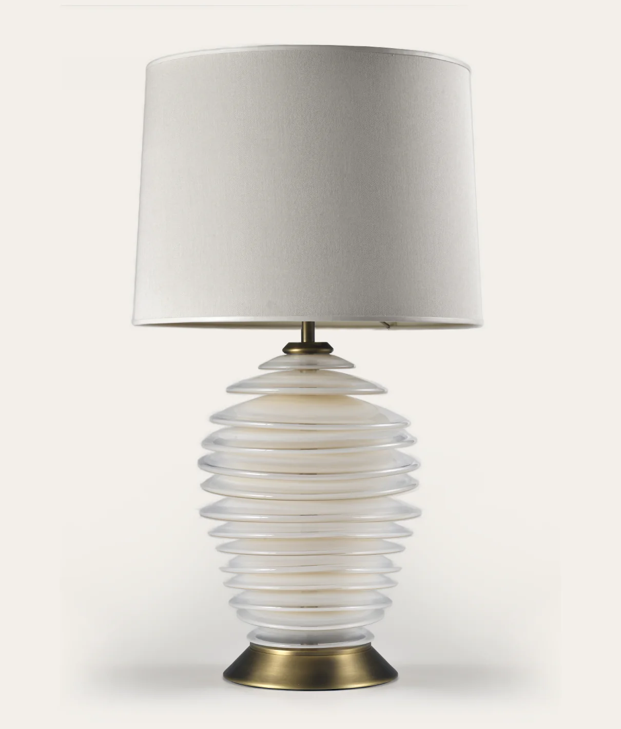 Sculptural character defines the Malik Table Lamp, with individually hand blown ombre glass discs in Ivory, artfully formed to create a truly unique design. Featuring antique brass detailing and diffuser at the top to softly disperse a gentle glow. Featuring a silk shade with a tonal faux leather trim, the lamp is perfect for transitional and modern decor. Each carries variations due to the bespoke nature of the design and it is this uniqueness that ensures it will gracefully endures the years. Also available in Bronze.